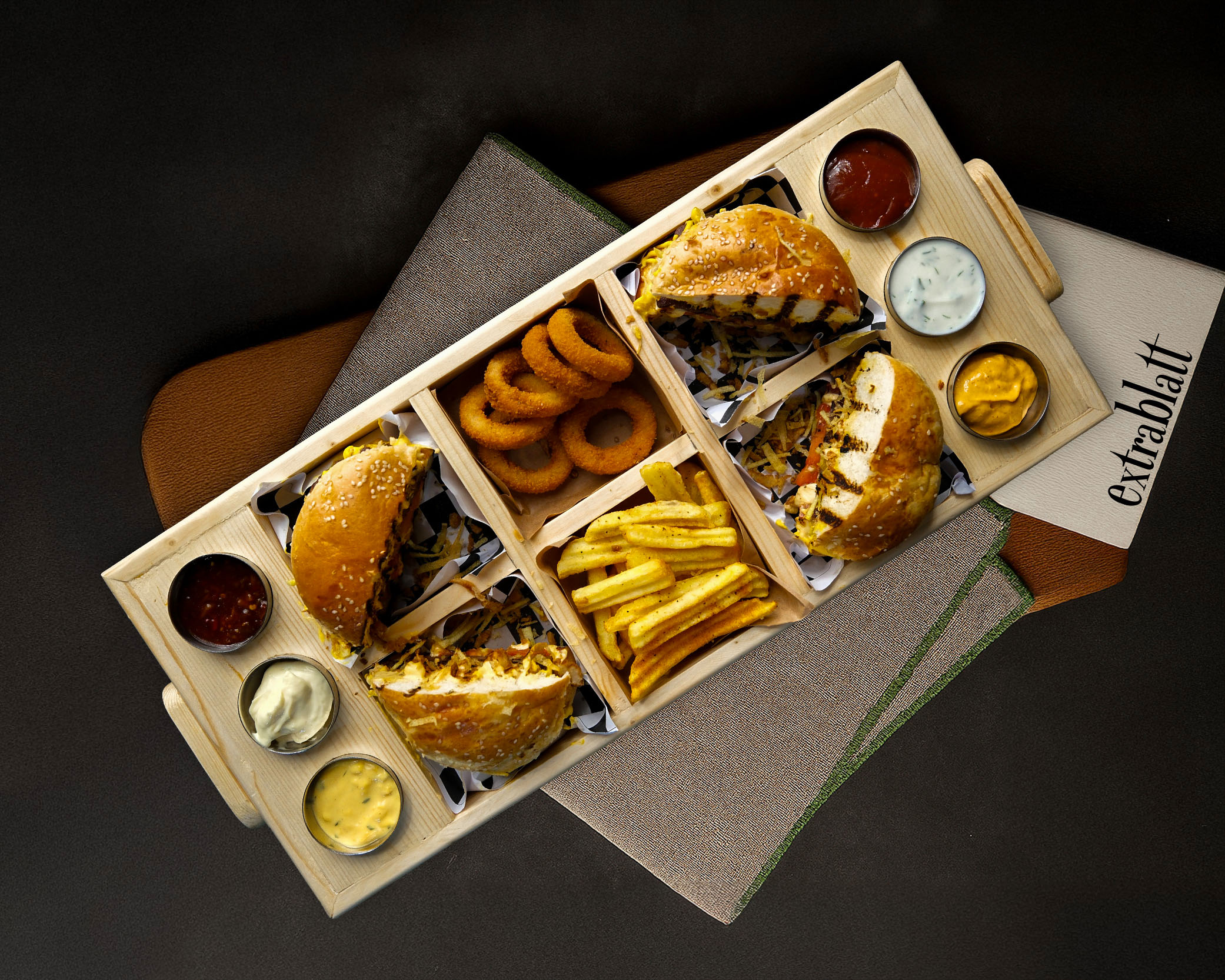 2 adet dana et burger; patates kızartması, soğan halkası, ketçap, acı sos, peri peri sos, ranch sos, barbekü sos ve romesco sos eşliğinde sunulur.