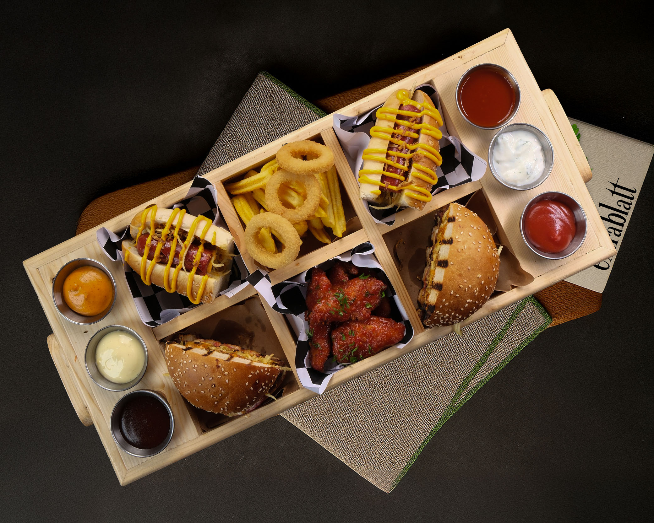 Dana et burger, hot dog, acılı çıtır tavuk, soğan halkası; ketçap, acı sos, peri peri sos, ranch sos, barbekü sos ve romesco sos eşliğinde sunulur.