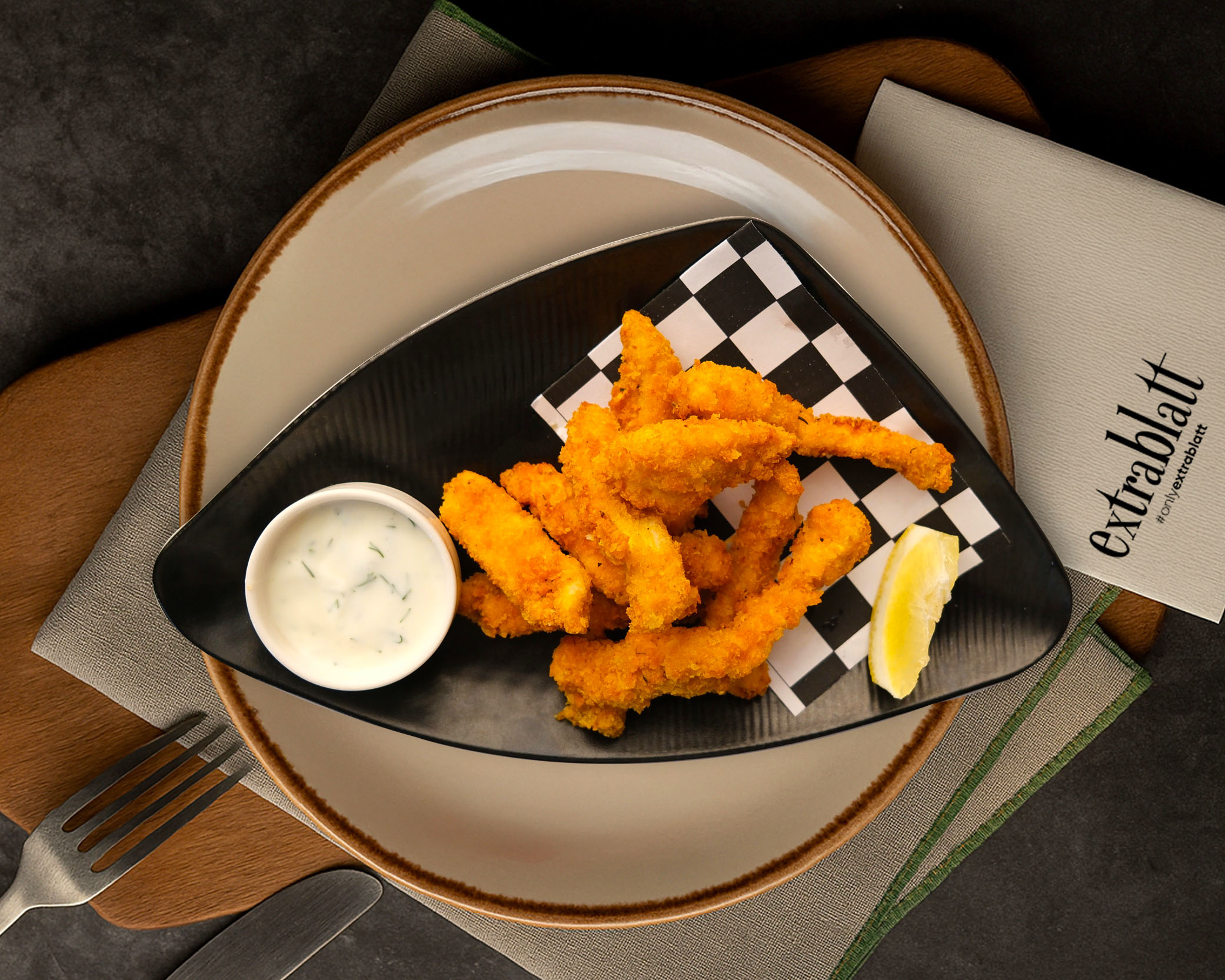 Çıtır tavuk parçaları; patates kızartması, cherry domates, lorolosso marul ve ranch sos eşliğinde sunulur.