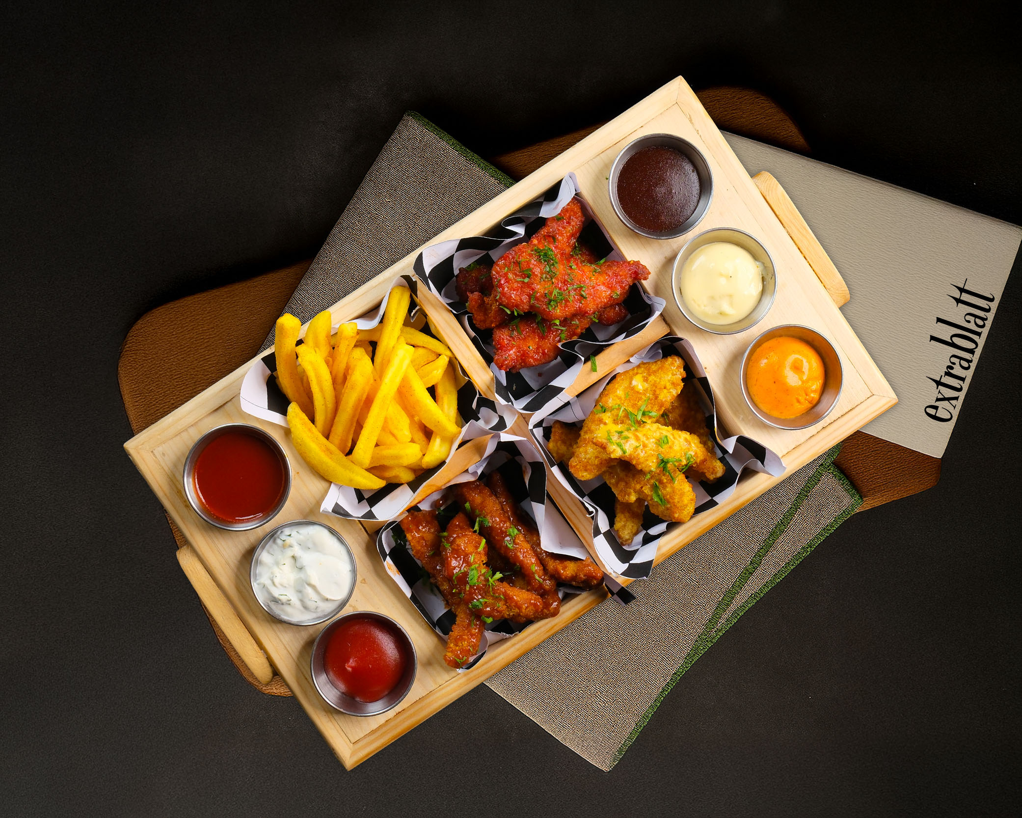 Acılı çıtır tavuk, sweet sour soslu çıtır tavuk, sweet chili soslu çıtır tavuk, patates kızartması; ketçap, acı sos, peri peri, ranch sos, barbekü sos ve romesco sos eşliğinde sunulur.