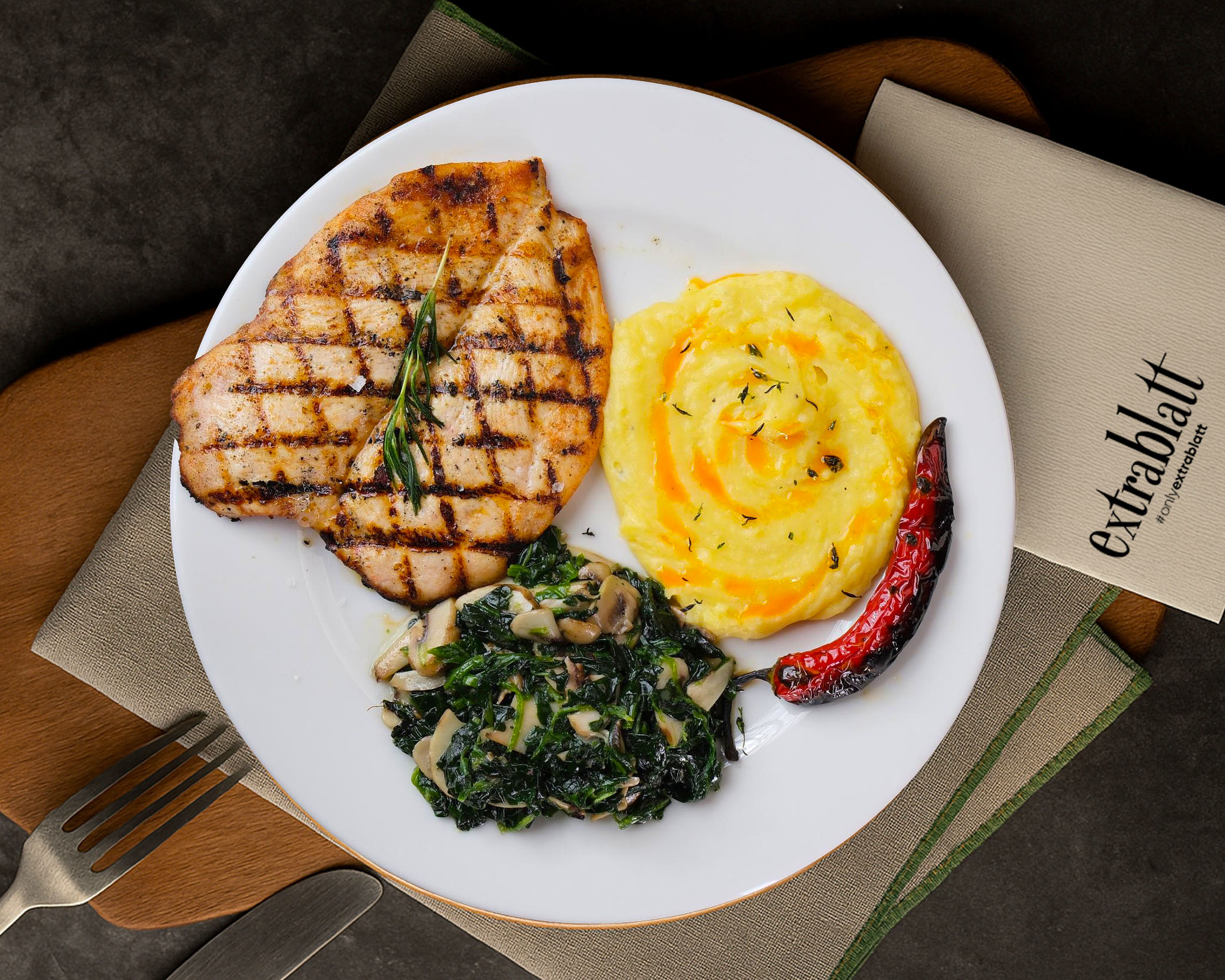 Tavuk göğüsü ; patates püresi ve mantarlı ıspanak sote eşliğinde servis edilir.