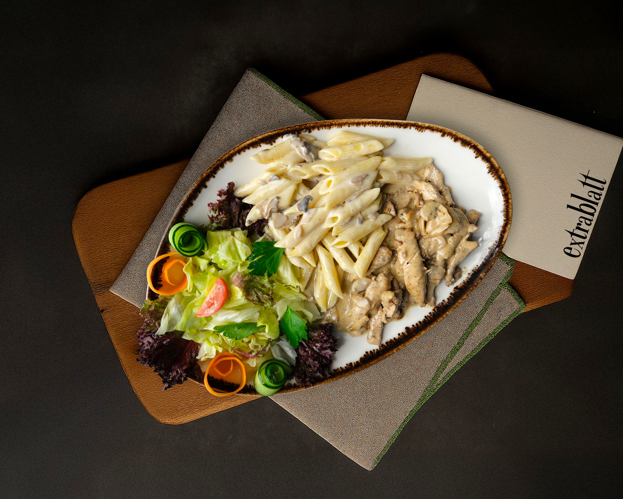 Tavuk gögsü parçalari, kremali mantar sos; makarna ve mevsim salata esliginde servis edilir.