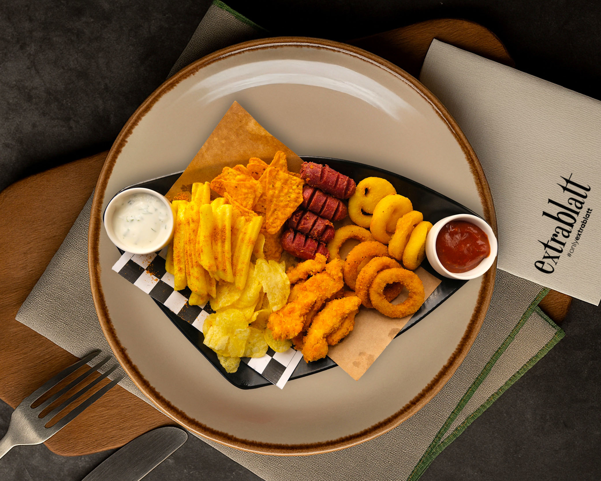 Çıtır tavuk parçaları, sosis, patates kızartması, soğan halkası, patates kroket, baharatlı cips ve patates cipsi; ranch sos ve romesco sos eşliğinde sunulur.