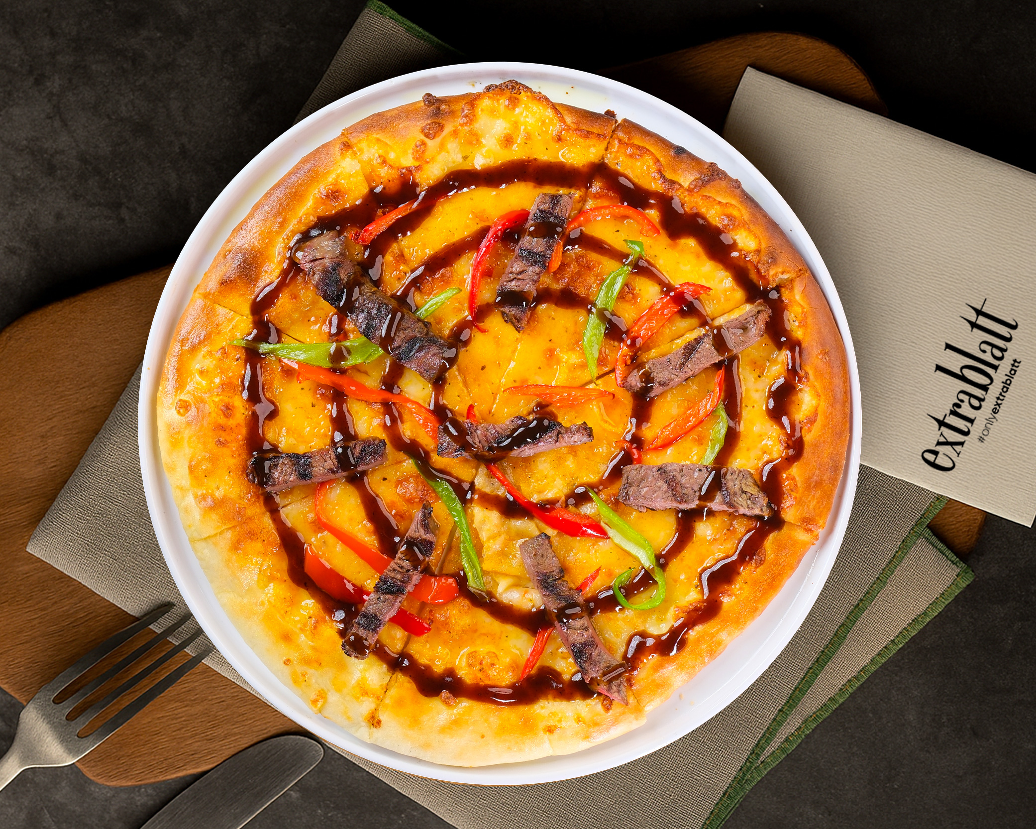 Pizza sosu, mozzarella peyniri, dana bonfile, barbekü sos, renkli biberler ile hazırlanır.