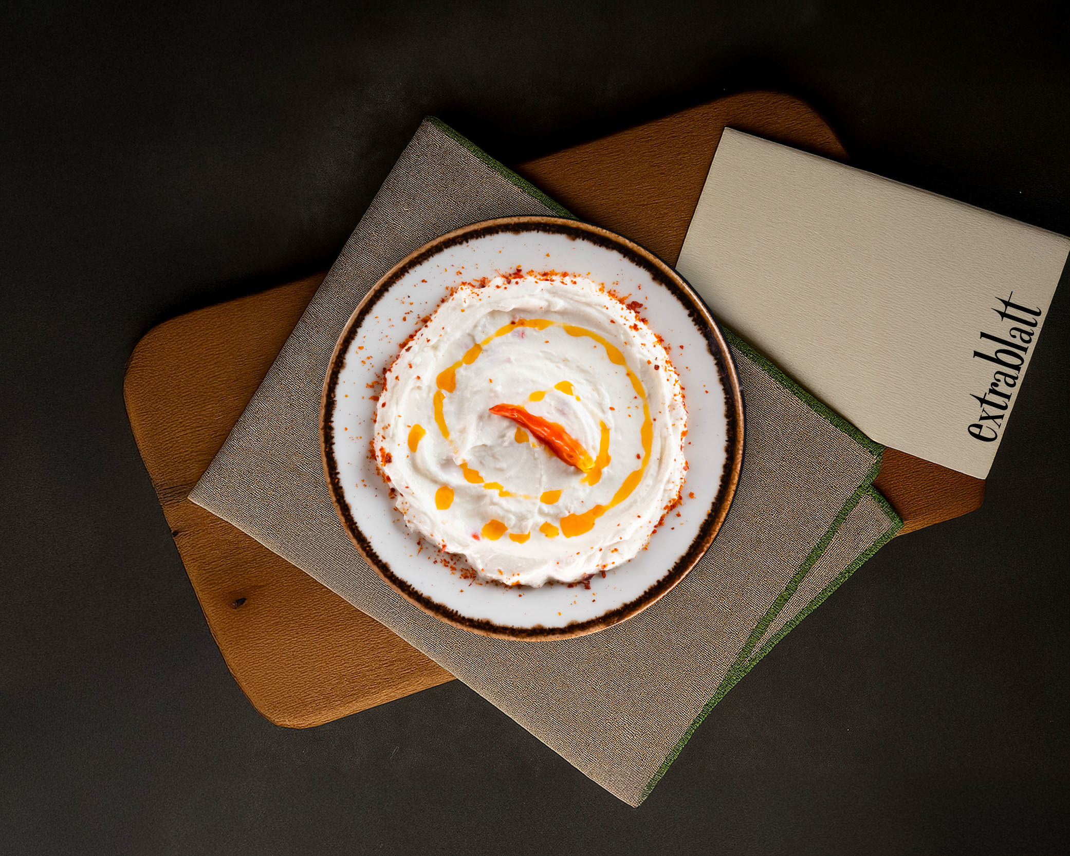 Süzme yoğurt, sarımsak, atom biber, kırmızı toz biber, zetin yağı ile hazırlanır.