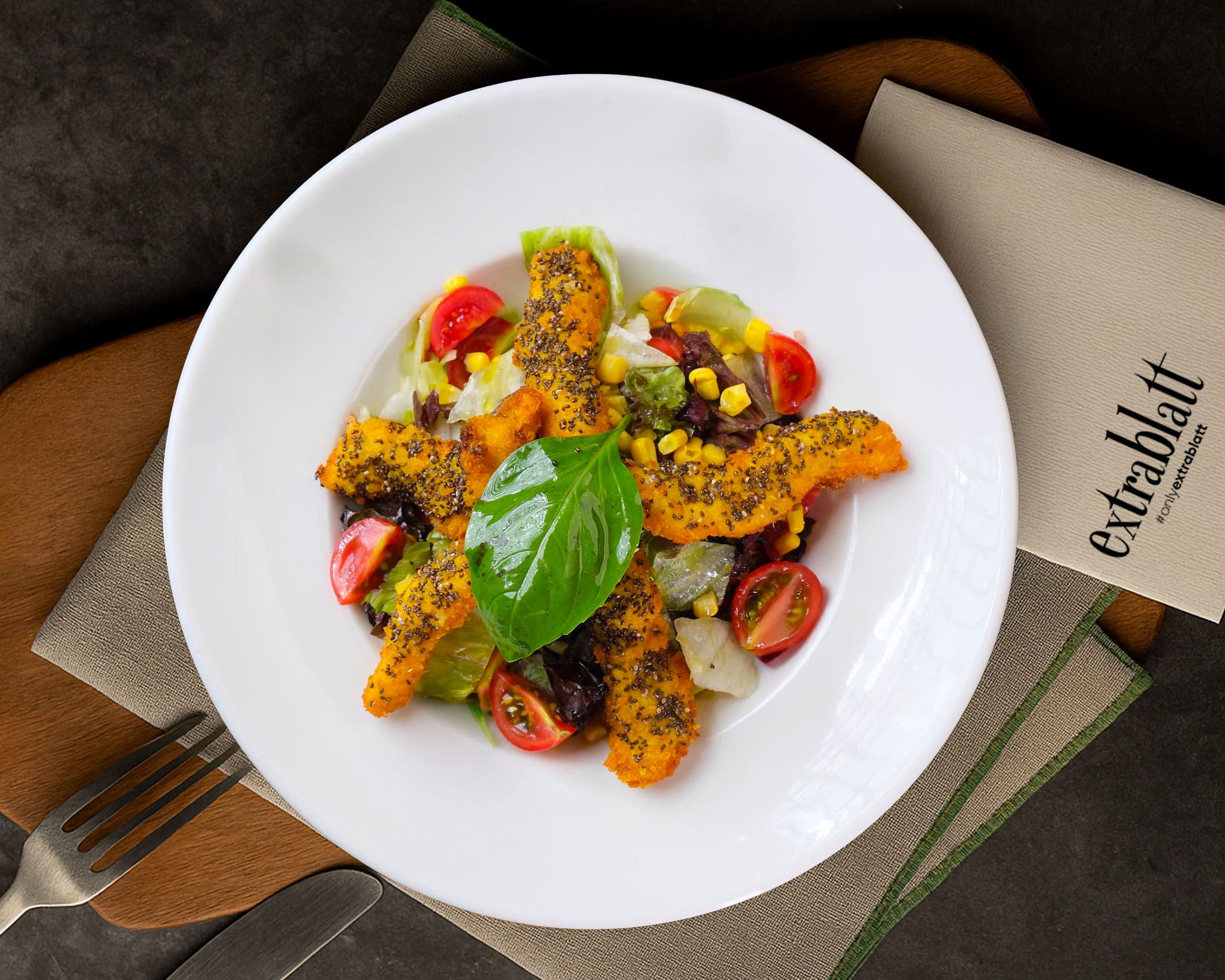 Akdeniz yesilligi, feslegen, salatalik, domates, misir taneleri, chia tohumu lle panelenmis tavuk gogsü parçalari, zeytinyagli limon sos ile hazirlanir